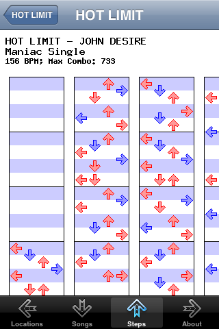 DDR Compendium also gives you access to "stepcharts", which display the entire step-layout for a song. If the arrows are scrolling too fast for you, you can load up the stepchart for that song (at any difficulty and with any modifiers), and then study it to help you improve. This feature is vital for people establishing a freestyle routine. With DDR Compendium, you have instant access to every single stepchart that has ever been created, wherever you are and whenever you want.